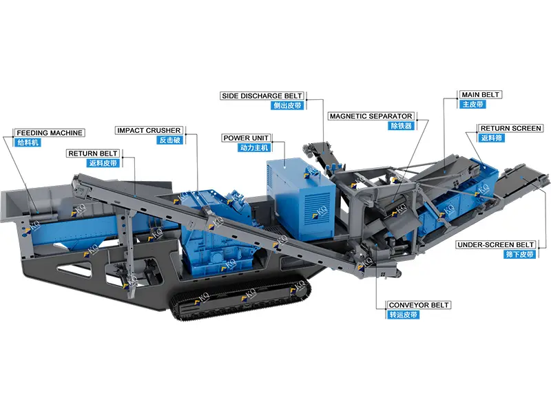 The tracked mobile impact crusher is specifically designed for efficient crushing and complex terrain operations. Equipped with a fully hydraulic tracked undercarriage and a hydraulic impact crusher, it delivers high crushing capacity, low operating costs, high versatility, and adjustable uniform particle size. It can be paired with a vibrating screen for integrated crushing and screening operations, or combined with tracked cone crushing stations and other equipment.